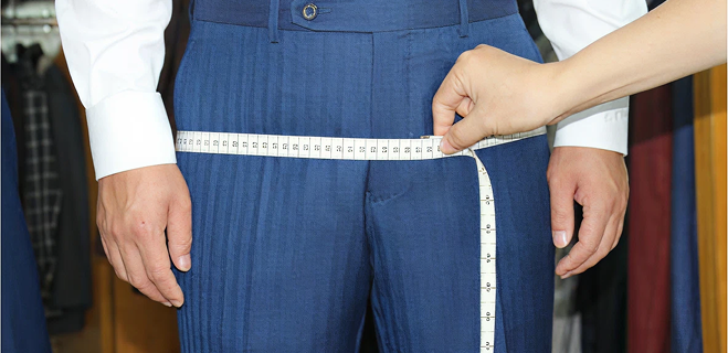 Stand at the side of client,squat to the same height of clients hip,measure the fullest part of hips and ensure the tape is horizontal (Put one figure between tape and chest to see tape can be slightly moved).Ensure nothing inside client’s pant pockets when measuring hip size.Allowance for hip size also depends on the pleats of pants and usually it’s 6-10cm.