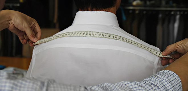 Stand at the back of client to see if he has a sloping,square or unequal shoulder.Measure from the left shoulder point(the shoulder bone) to right shoulder point.Usually shoulder size measured is finished size on jacket